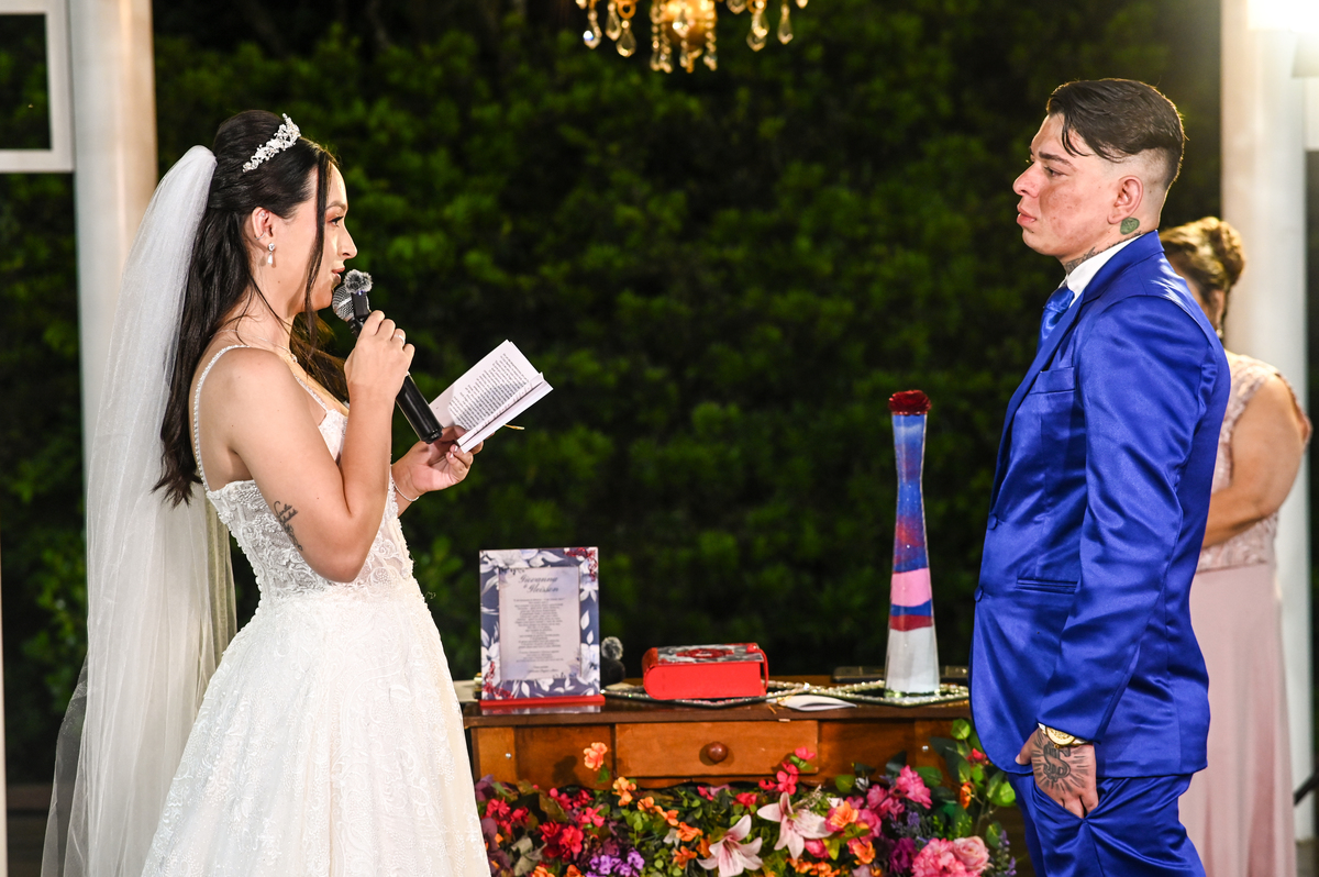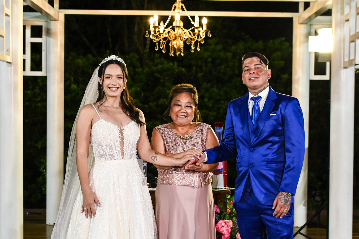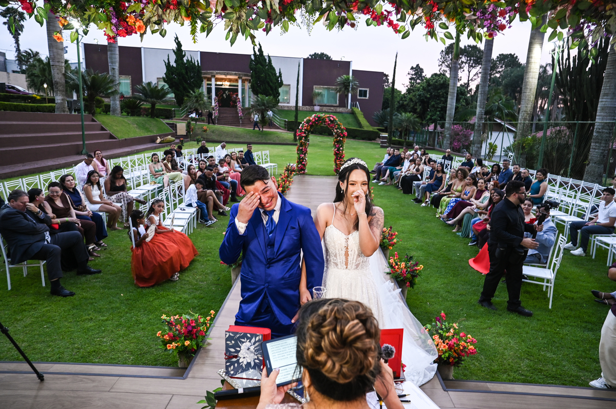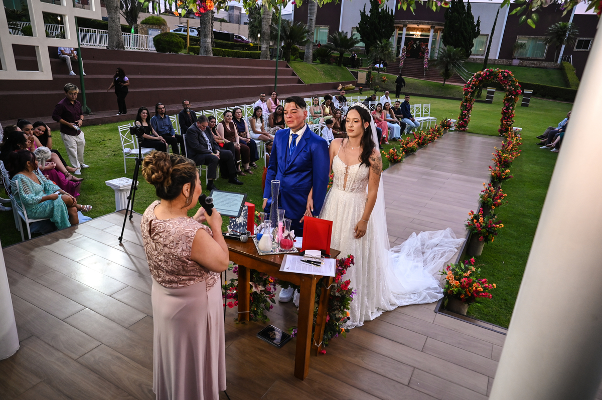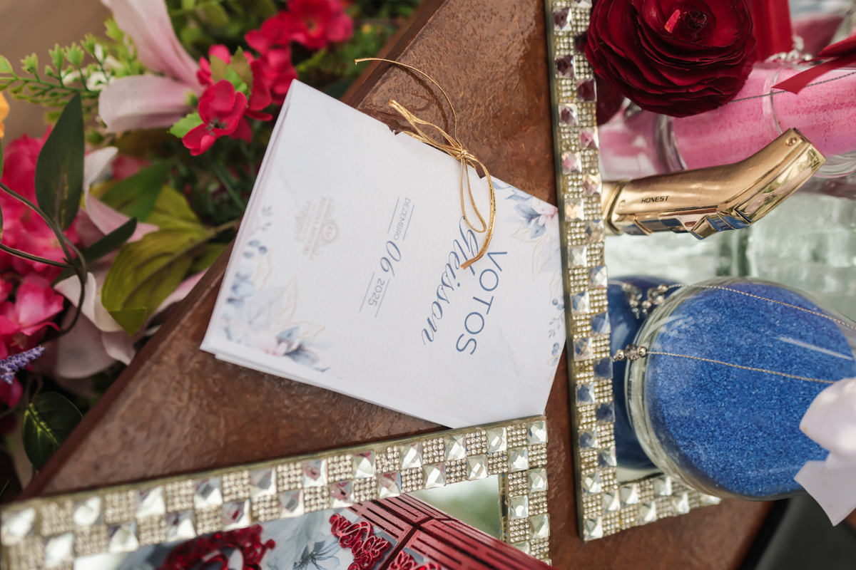 A cerimônia, conduzida com sensibilidade e doçura pela celebrante Regina Midori, tocou o coração de todos os presentes. As palavras ditas ali não foram apenas promessas, mas declarações sinceras de uma história construída com cumplicidade, respeito e muito amor. As lágrimas vieram sem pedir licença — misturadas a sorrisos verdadeiros e abraços cheios de significado.