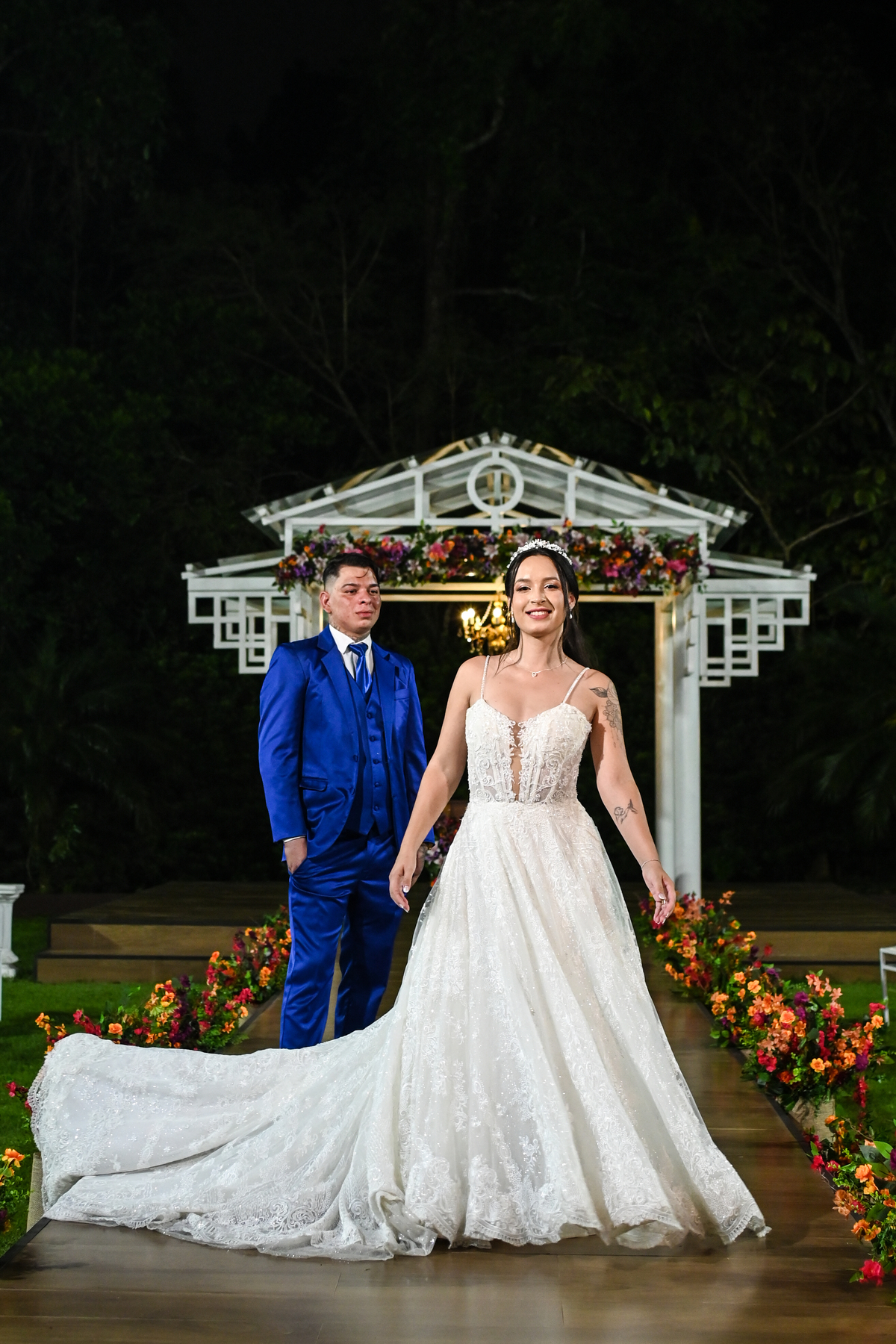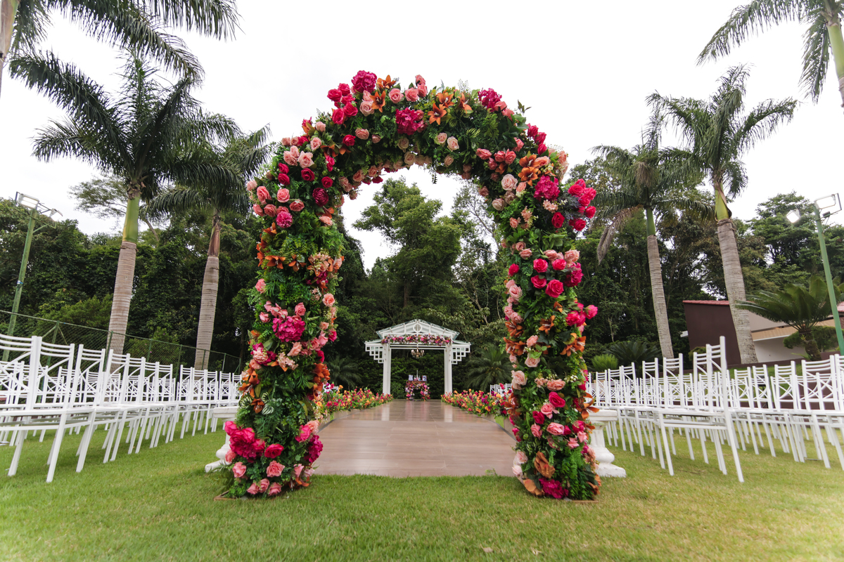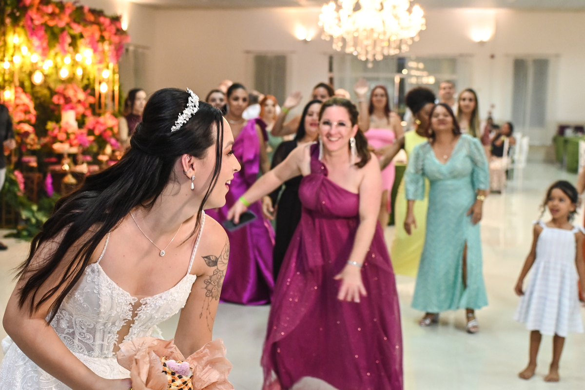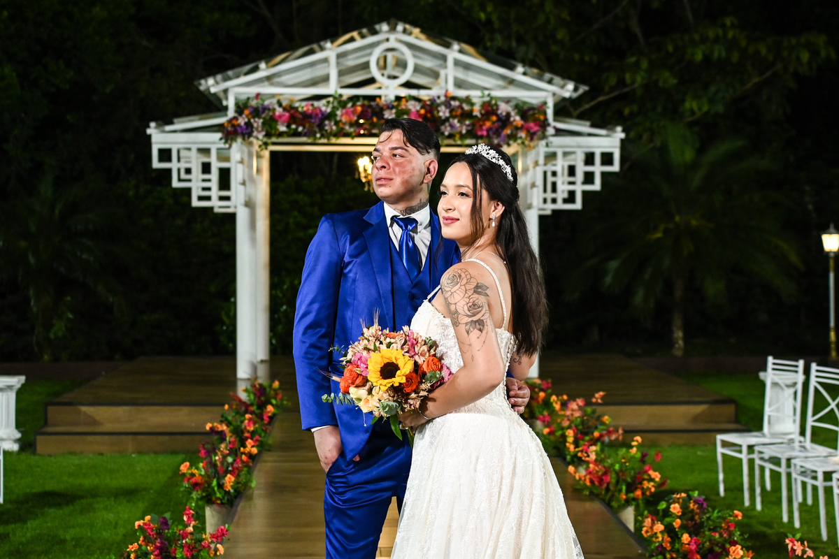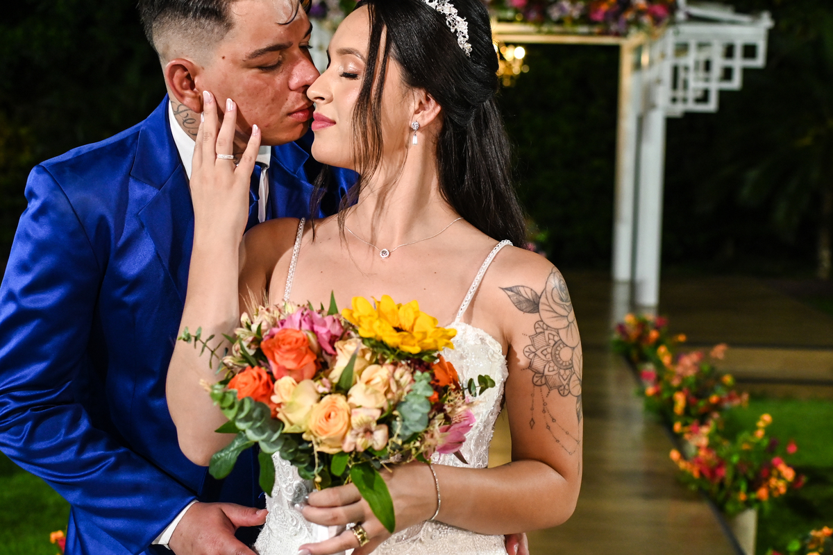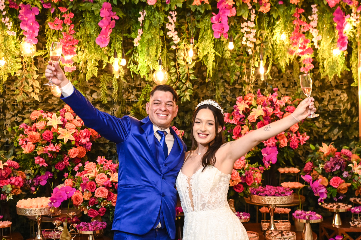 A beleza do cenário ganhou vida com a decoração assinada pela DecorAnna.Festas, criando um ambiente acolhedor e romântico, onde cada detalhe parecia refletir a essência do casal. A noiva, radiante em seu vestido da Nova Noiva, viveu momentos de emoção e expectativa enquanto se preparava no Salão Leandro Fernandes, sentindo o coração bater mais forte a cada minuto que se aproximava do “sim”.
