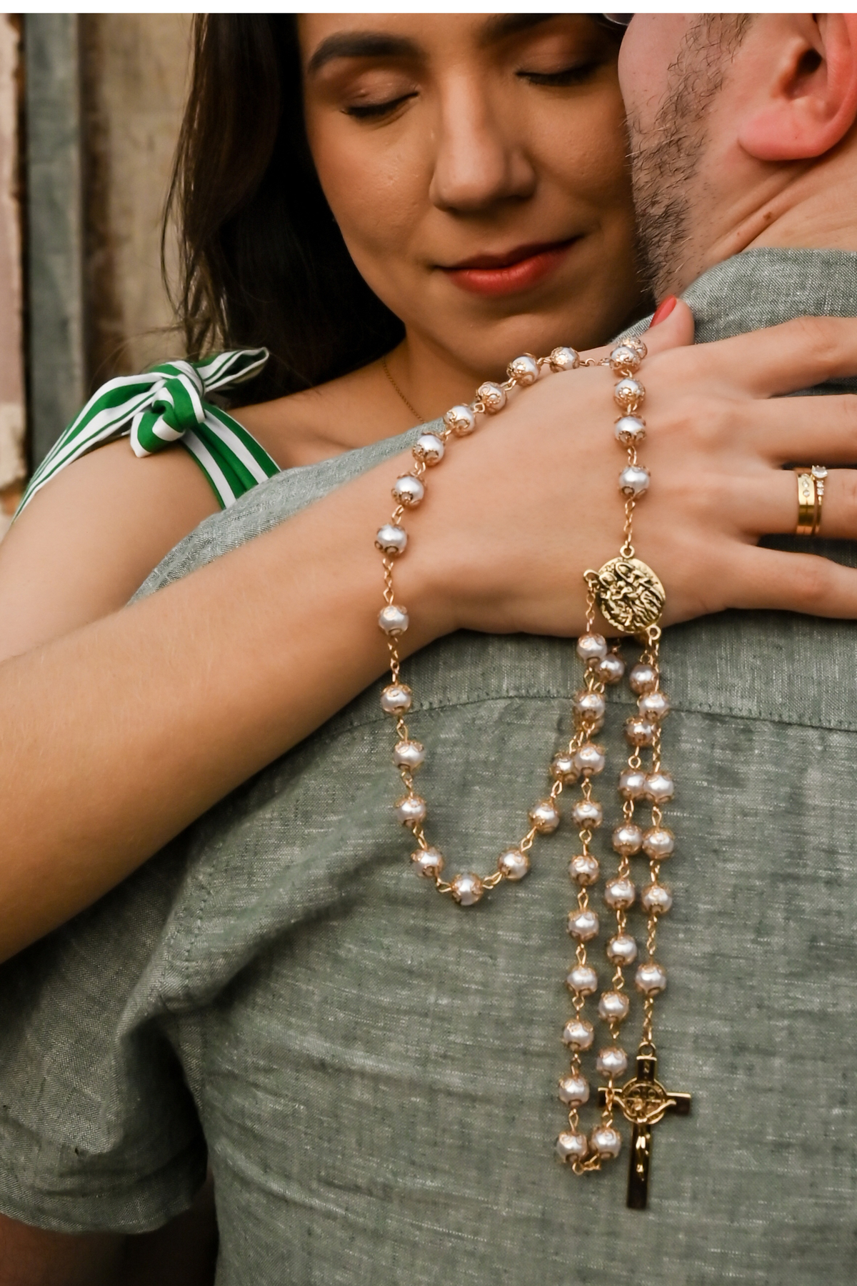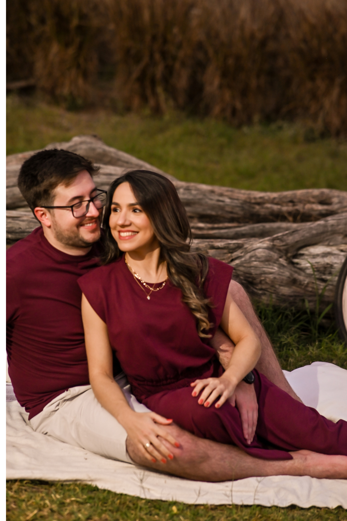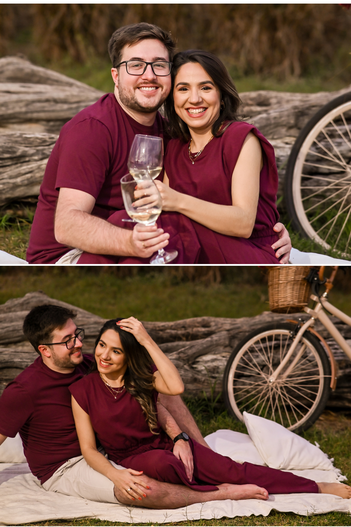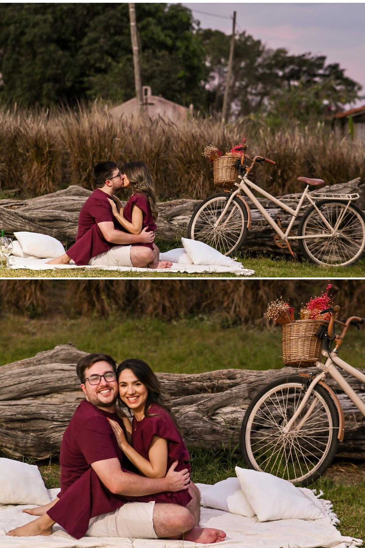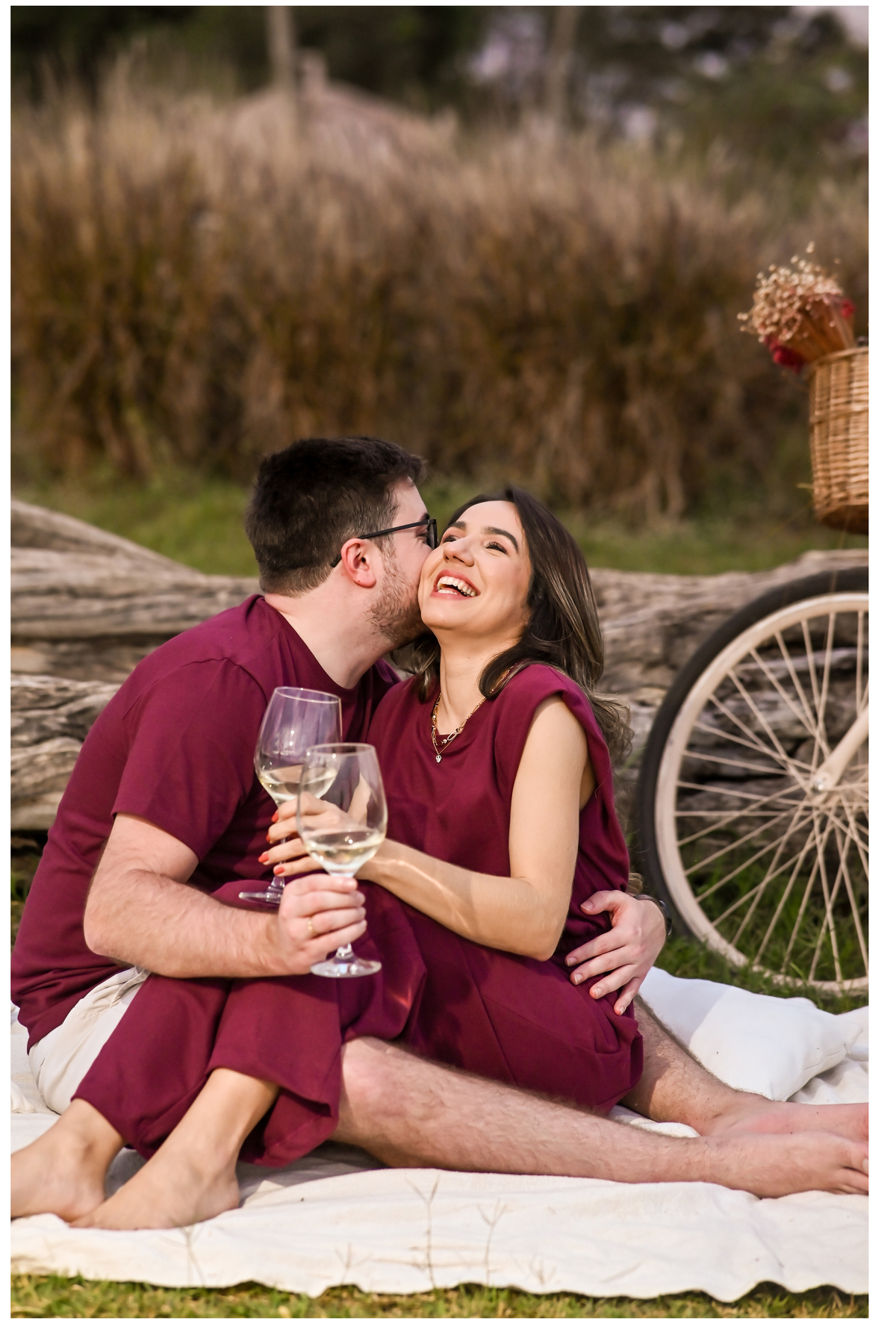 vestidos do casal com uma paleta de cores neutras e sem estampas,